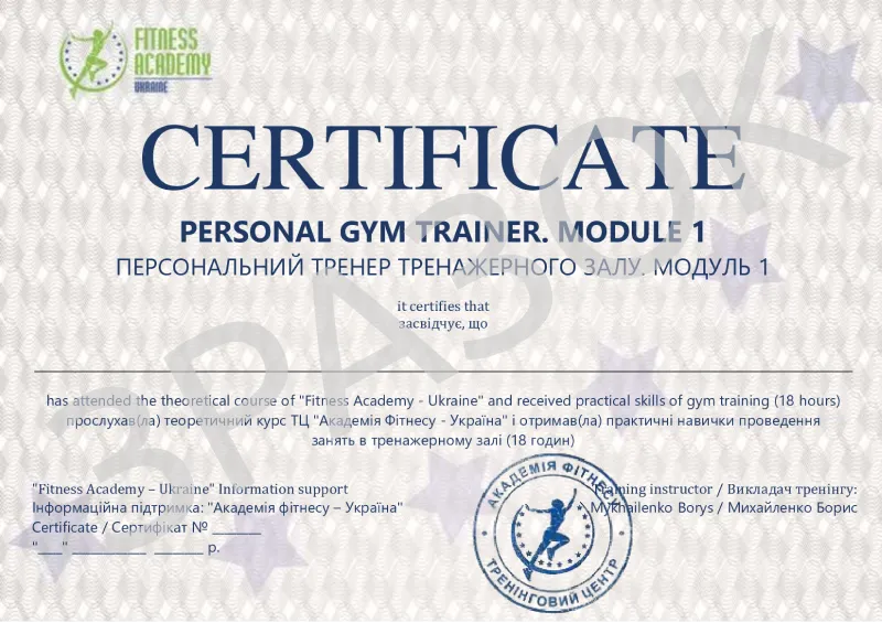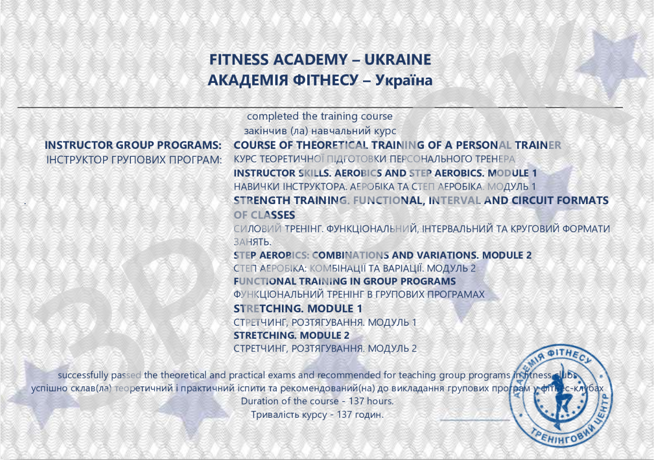 Сертифікат підтверджує участь у тренінгу в Академії Фітнесу – Україна. Документ є перевагою для роботодавця при працевлаштуванні. Видається після складання тестування та виконання завдань.