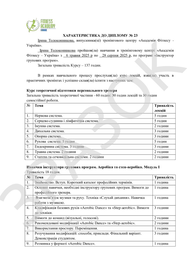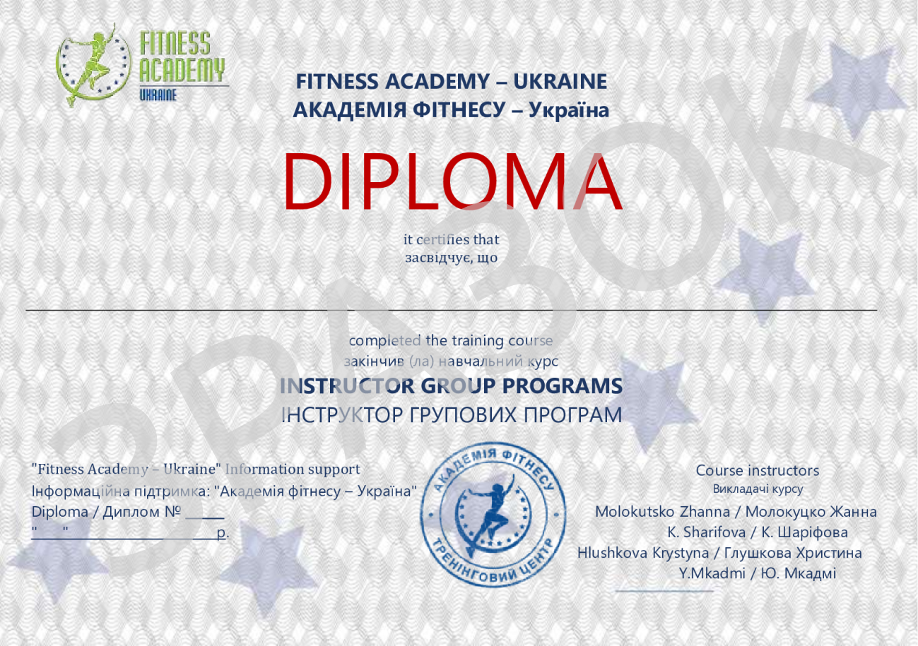 Диплом підтверджує проходження учасником повного курсу навчання та складання іспитів. До диплому додається характеристика. Ці документи є рекомендацією вас як спеціаліста від Академії Фітнесу — Україна, вони підтверджують вашу кваліфікацію та відкривають можливості у фітнес-індустрії.