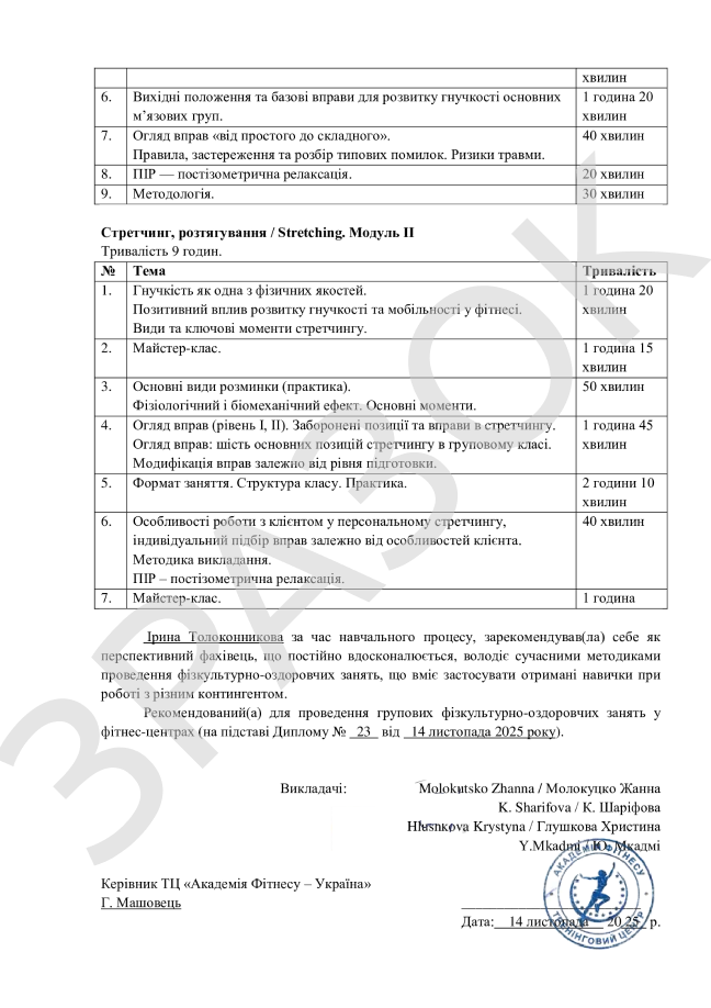 Після проходження програми студенти складають підсумкове тестування та отримують офіційний сертифікат. Документ підтверджує кваліфікацію та може бути використаний для працевлаштування у фітнес-клубах, студіях, реабілітаційних центрах і спортивних організаціях.