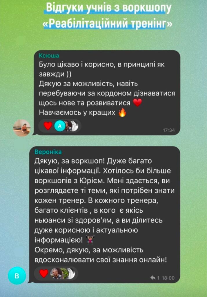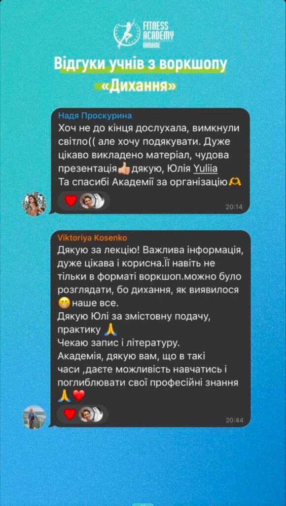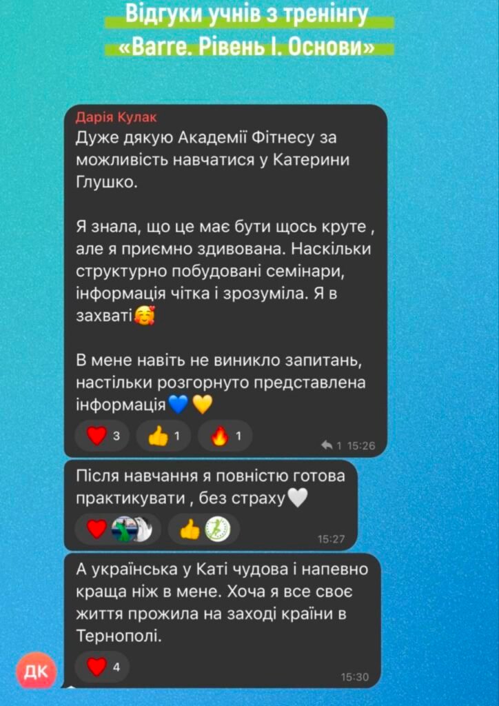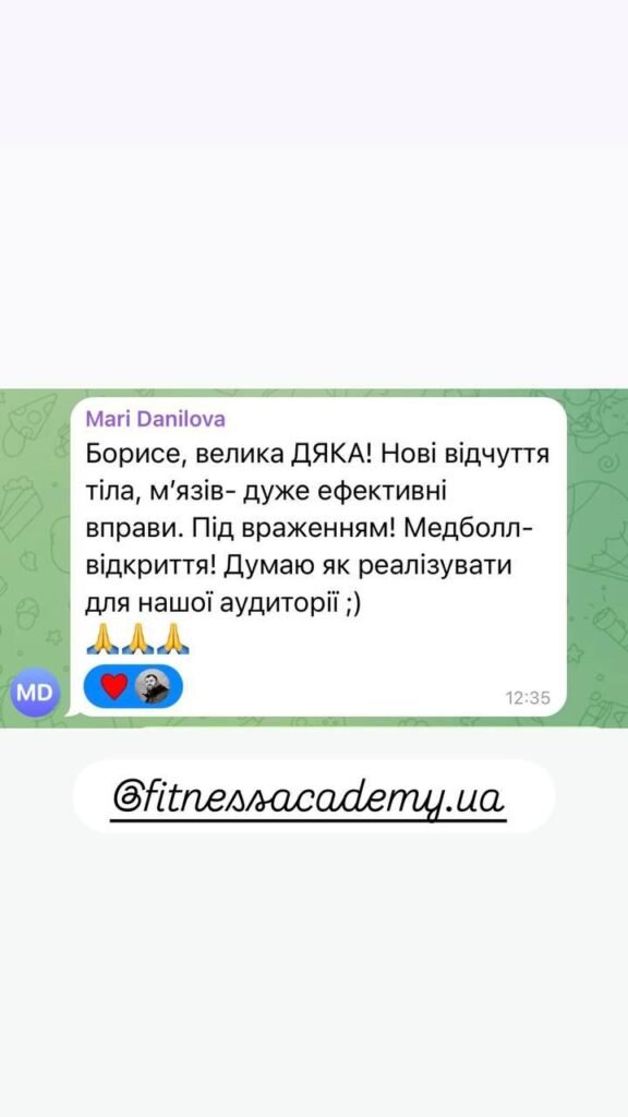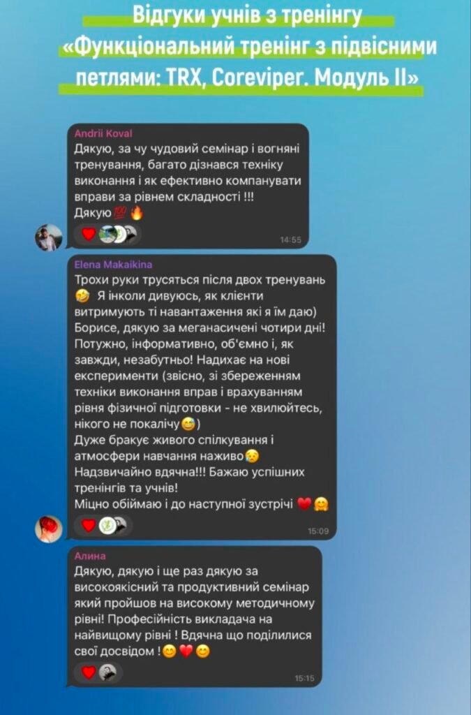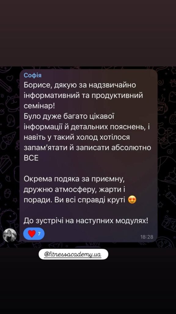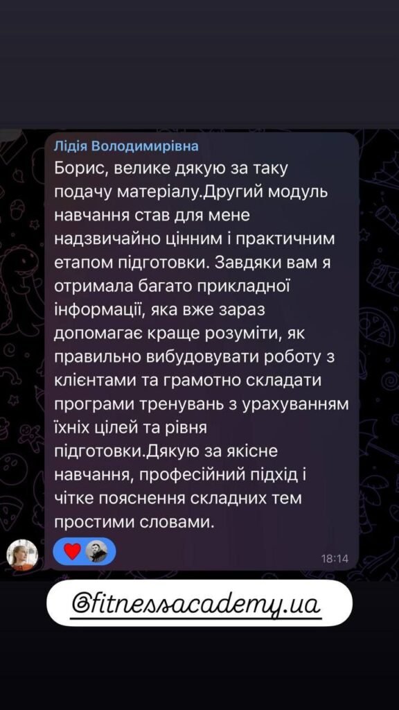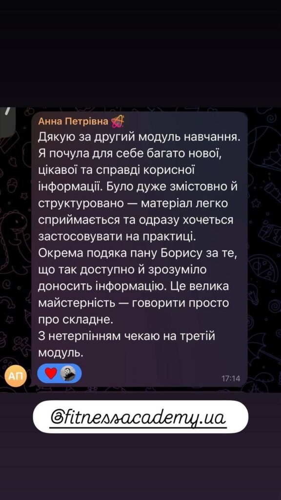 Добрий день, бажаю залишити позитивний відгук про навчання в «Академії фітнесу України».Він дає потужну базу для старту персонального тренера та максимум корисної інформації для будь-якого співробітника фітнес клуба. Під час тренінгу відчула натхнення та бажання зробити фітнес послуги кращими, підвищити якість та сервіс в клубі. Завдяки наданій інформації маю чітке розуміння ситуації в клубі де працюю, та напрямок в якому потрібно розвиватись не тільки як тренер, але і керівник. Борис, дякую Вам, що ділитесь своїм цінним досвідом та знаннями, все дуже сподобалось🫶