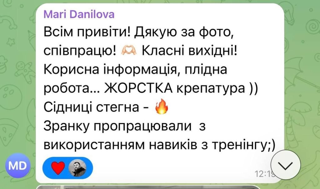 Добрий день, Марія! Сертифікат отримано. Дякую ВАМ за надану можливість удосконалити свої знання. Я отримала потрібні уроки і розуміння того як слід робити справи людям похилого віку, щоб не нашкодити, а навпаки зміцнити здоров’я. Велика подяка Борису, він викладає цікаво і вміє донести найважливіше. Не дивлячись на мій вік, я відчувала емоційний підйом, хороший настрій і бадьорість духу. Бажаю щоб ви і надалі долучали більше людей до здорового способу життя.❤️