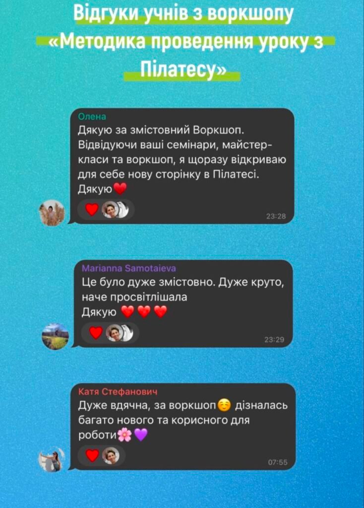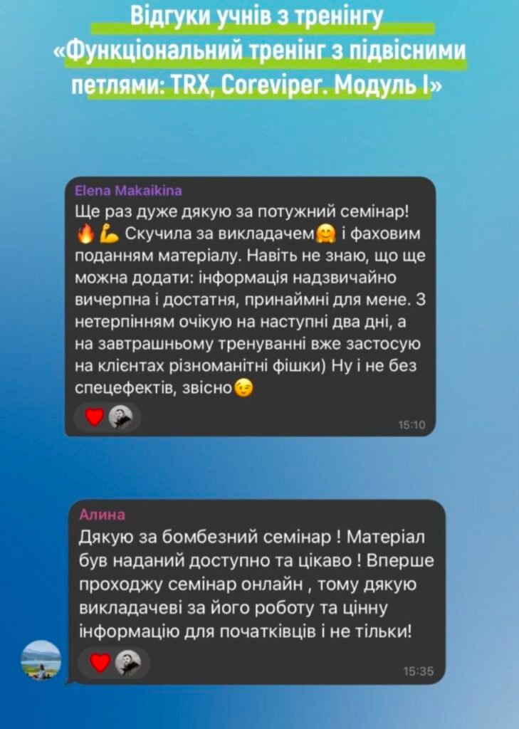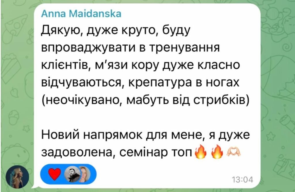 Я, дуже рада що пішла до Вас на навчання. Для мене це було мега потужно, цікаво, пояснюєте дуже доступно і зрозуміло) Після такого навчання зявляється більше впевненості в собі як тренера.